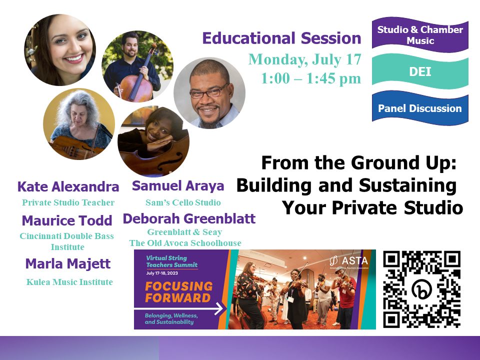 That same year, she organized and moderated the panel “From the Ground Up: Building and Sustaining your Private Studio” for the 2023 ASTA Virtual String Teachers Summit.